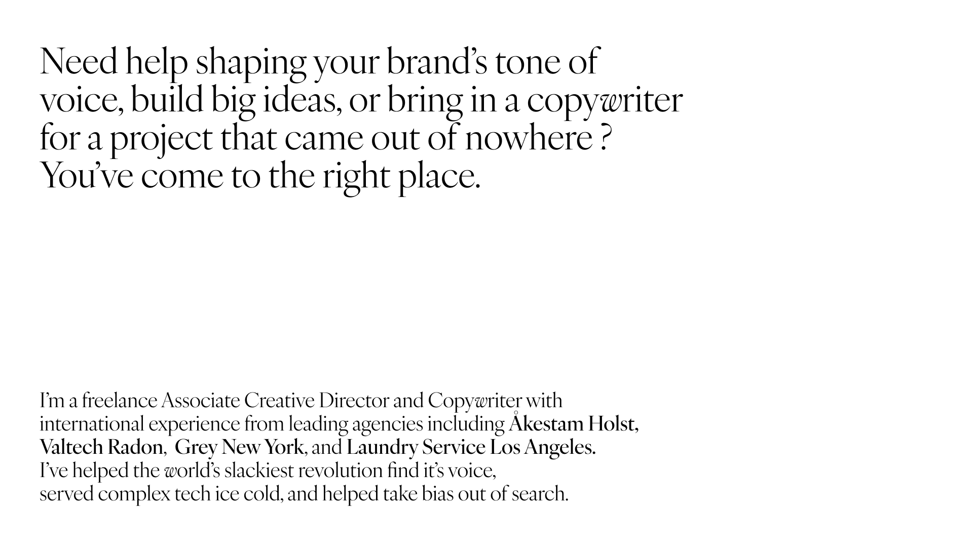Clients I’ve worked with — Prime Weber Shandwick, Åkestam Holst, Peak Performance, Tanrevel, Studio Constance, Pantene, YouTube, Disney, Klarna, RFSU, Einride, The Red Cross, Arla, Fitbit, Barefoot Wines, Swedish Match, IsaDora, Interflora, Yale, Hasbro, DreamWorks, Head & Shoulders, Electrolux —